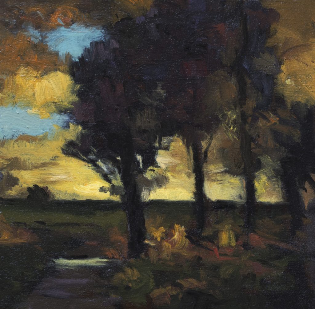 Welcome to another tonal landscape oil painting demonstration. This is your painter in residence, Michael Francis McCarthy. And the painting I’m bringing you today is called “Riff on Francis Murphy, Evening.” I painted this back in September of 2025 and I’ve been sitting on it that whole time. Let me tell you the tale.